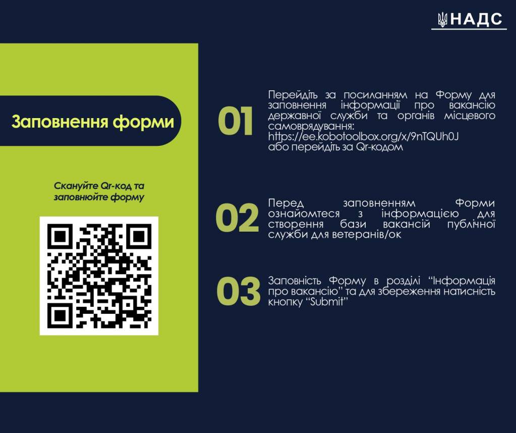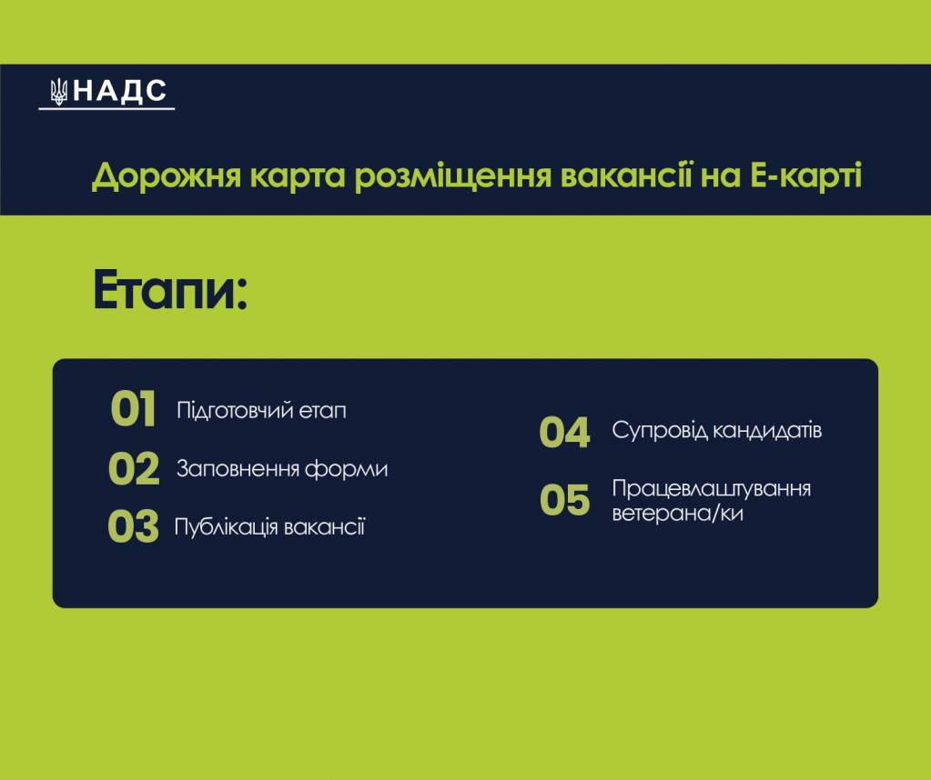 Після заповнення форми інформація про вакансію буде розміщена на Е-карті вакансій державної служби та служби в органах місцевого самоврядування для ветеранів та ветеранок (далі – Е-карта). Така Е-карта буде розміщена на платформах Міністерства у справах ветеранів.