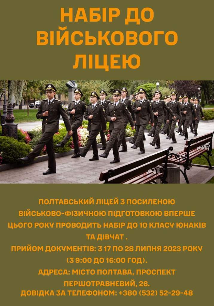 Цього року Полтавський ліцей з посиленою військово-фізичною підготовкою вперше проводить набір на навчання юнаків та дівчат. На навчання приймають учні, які закінчили 9 класів.