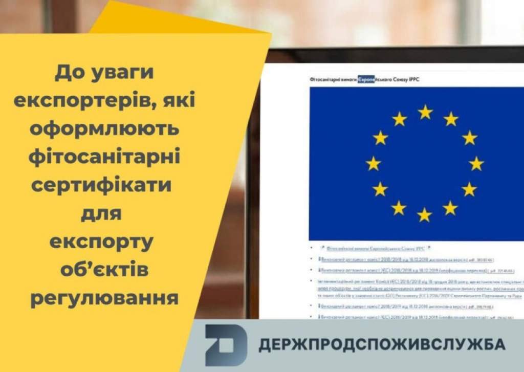 Держпродспоживслужба повідомляє, що у зв’язку із приєднанням України до міжнародної централізованої інформаційної системи ePhyto HUB, яка забезпечує обмін фітосанітарними сертифікатами та фітосанітарними сертифікатами на реекспорт (ePhyto), об’єкти регулювання, включені до Переліку об’єктів регулювання для цілей імпорту, експорту та реекспорту, затвердженого постановою Кабінету Міністрів України від 15 листопада 2019 р. № 1177, вивозяться за межі митної території України у супроводі фітосанітарного сертифіката або фітосанітарного сертифіката на реекспорт, виданого в електронній формі.
