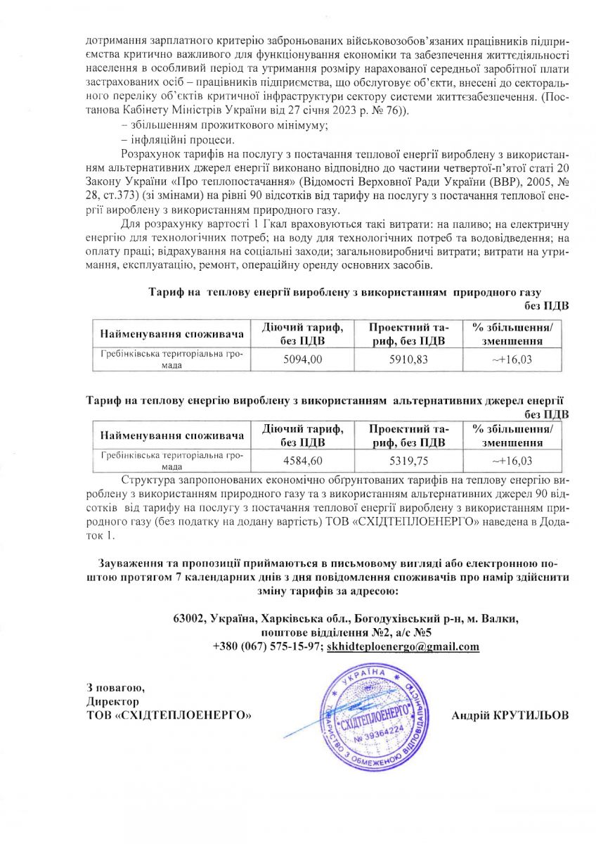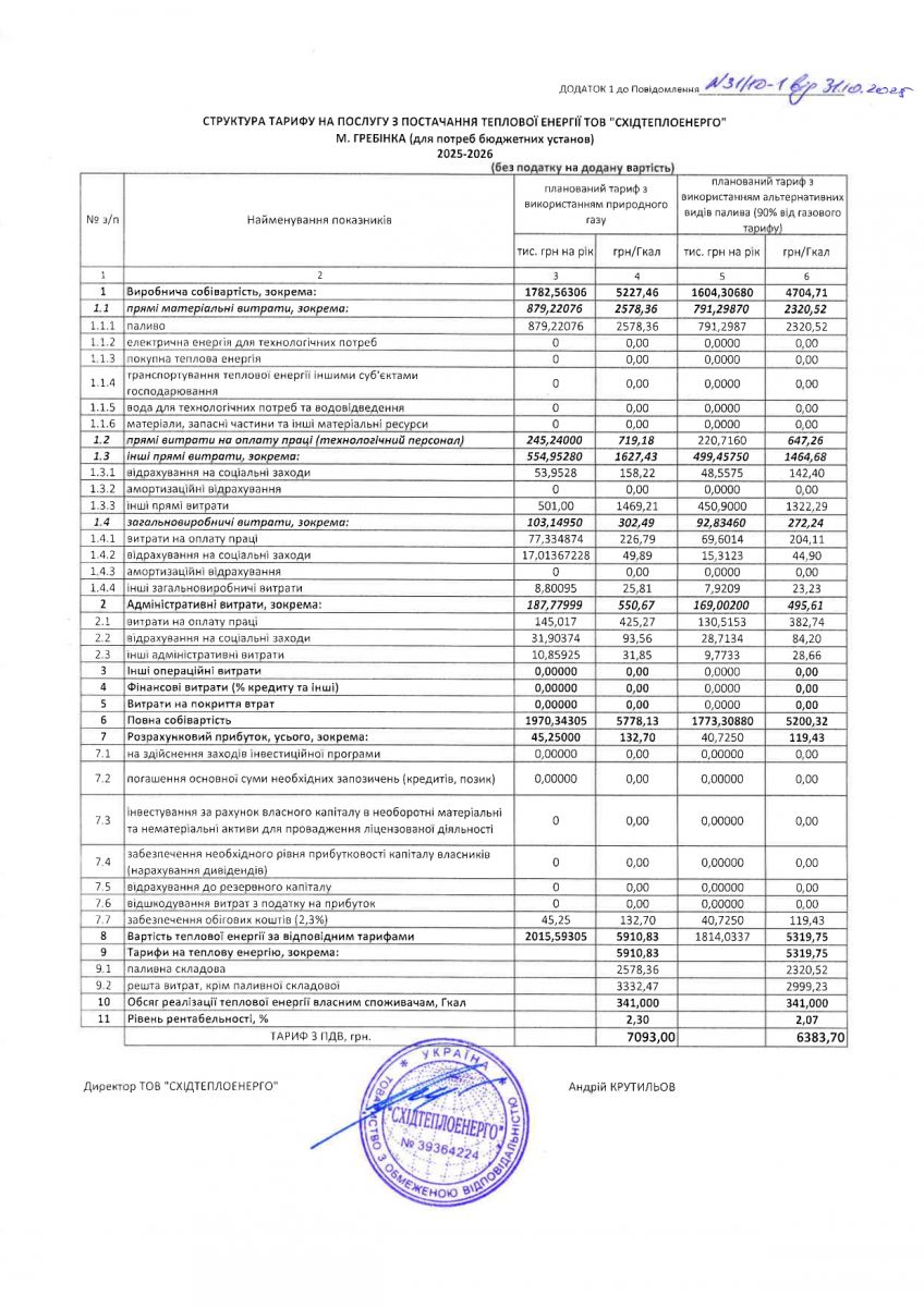 Повідомлення про намір здійснити коригування (перегляд) діючих тарифів на теплову енергію, що надається ТОВ «СХІДТЕПЛОЕНЕРГО» на території Гребінківської міської територіальної громади. Інформаційне повідомлення про проведення в електронній торговій системі продажу на аукціоні з умовами об’єкта малої приватизації будівлі за адресою: Полтавська обл., Лубенський р-н, с. Тополеве, вул. Руслана Осіновського, буд. 7 під розбирання. 16 вересня 2025 року Оголошення про відкриття провадження в адміністративній справі №440/12422/25 за позовом Лукінової Марії Василівни до Гребінківської міської ради про визнання протиправним та скасування рішення. Інформація виконавчого комітету Гребінківської міської ради про підсумки конкурсів з відбору суб’єктів оціночної діяльності, які будуть залучені для проведення експертної грошової оцінки земельних ділянок комунальної власності під об’єктами нерухомого майна, що підлягають продажу. Звіт про опрацювання пропозицій до проекту Муніципального енергетичного плану Гребінківської міської територіальної громади на період до 2030 року. Інформація про оголошення конкурсу з відбору суб’єктів оціночної діяльності у сфері оцінки землі. На виконання Національної стратегії із створення безбар’єрного простору в Україні на період до 2030 року, затвердженої розпорядженням Кабінету Міністрів України від 14 квітня 2021 року №366-р, Протокольного рішення №1 від 08 квітня 2025 року засідання місцевої Ради безбар’єрності при виконавчому комітеті, Гребінківська міська рада рекомендує керівникам підприємств привести у відповідність вимогам державних будівельних норм ДБН В.2.2-40:2018 «Інклюзивність будівель і споруд. Основні положення», об’єкти, які перебувають у власності чи оренді. 30 травня 2025 року Оголошення про відкриття провадження в адміністративній справі №440/7212/25 за позовом Жилої Олени Василівни до Гребінківської міської ради про визнання протиправним та скасування рішення.